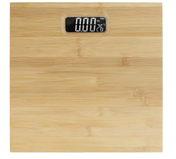 Bathroom scale made of natural bamboo with a thermometer of 30x30 cm The presented bamboo scale is not only handy, but also beautiful! The housing is made of bamboo. Thanks to this, the scale will look very nice in a white or gray bathroom. After weighing, you put most of the scales back in the closet, but this one is much too good for that. The scale turns off automatically when not in use. The scale has dimensions of 30 x 30 cm, so it will not take up much space in your bathroom. You can also easily put it under the bed or put it in the closet. The scale displays the weight digitally. Technical specification: Color: brown Material: wood Maximum load: 150 kg Dimensions: 30x30 cm Thermometer, Battery powered (2x AAA, not included)