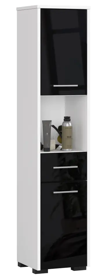 Bathroom racks are functional furniture that allows you to maintain order in the bathroom. Inside you can place towels, cosmetics and other accessories related to maintaining personal hygiene. Racks can also look fashionable. An example of this is the FIN 2D 1SZ 1W bathroom shelving post, which catches the eye with its colors - a combination of white with black with gloss. The whole is complemented by silver door handles. The furniture consists of a shelf, a drawer and two wardrobes, giving a lot of free spaces to develop. By the way, it is characterized by durability and solidity of workmanship.