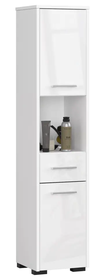 Bathroom shelving post FIN 2D 1SZ WHITE is a functional piece of furniture in which you can store cosmetics, towels and other items. It has a fashionable glossy white color, perfectly matching the minimalist and modern bathrooms. The door handles are silver in color. The post is distinguished by its simple form and elegance. Makes it easier to keep order in the bathroom. It consists of a shelf, a drawer and two cabinets, which gives a lot of free spaces to develop. All offered bathroom shelving posts are characterized by resistance and impeccable aesthetics.