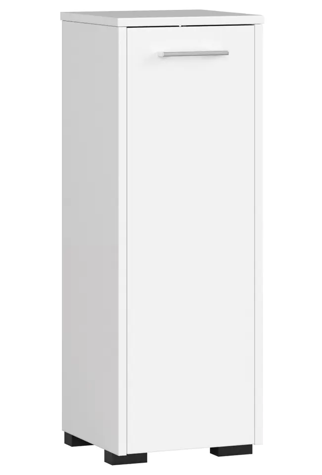 White standing bathroom cabinet is a very practical and elegant piece of furniture in its simplicity. Thanks to its small dimensions, it will also be used in small bathrooms. Spacious shelves of the cabinet will accommodate towels, cleaning products or spare soaps or cosmetics. The cabinet can also be used for a bathroom scale, hair styling equipment or a foot massager. Located at a comfortable height, the cabinet top can be used for everyday cosmetics and perfumes or a decorative make-up mirror. The cabinet is made of laminated board, which is resistant to moisture and abrasion. The furniture is finished with durable and non-discolouring melamine veneer. The cabinet can be washed as often as possible without fear of damaging its surface. White standing bathroom cabinet fits bathrooms with light and dark glaze, as well as classic and retro decorated with gilded fittings. The furniture in combination with the washbasin cabinet from the same collection will be visually attractive and functional bathroom equipment.