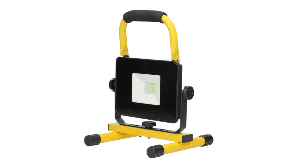 Portable LED floodlight with built-in 4400mAh Li-ion battery and high degree of IP65 tightness is designed to illuminate work performed outdoors, in home, garage, basement, car, camping, etc. It is equipped with SMD LEDs, hermetic button, powerful carrying handle, practical rotating, detachable stand with 360° horizontal and vertical (up-down) adjustment. The luminaire has two lighting modes of 100% and 50%. A wall charger is included.