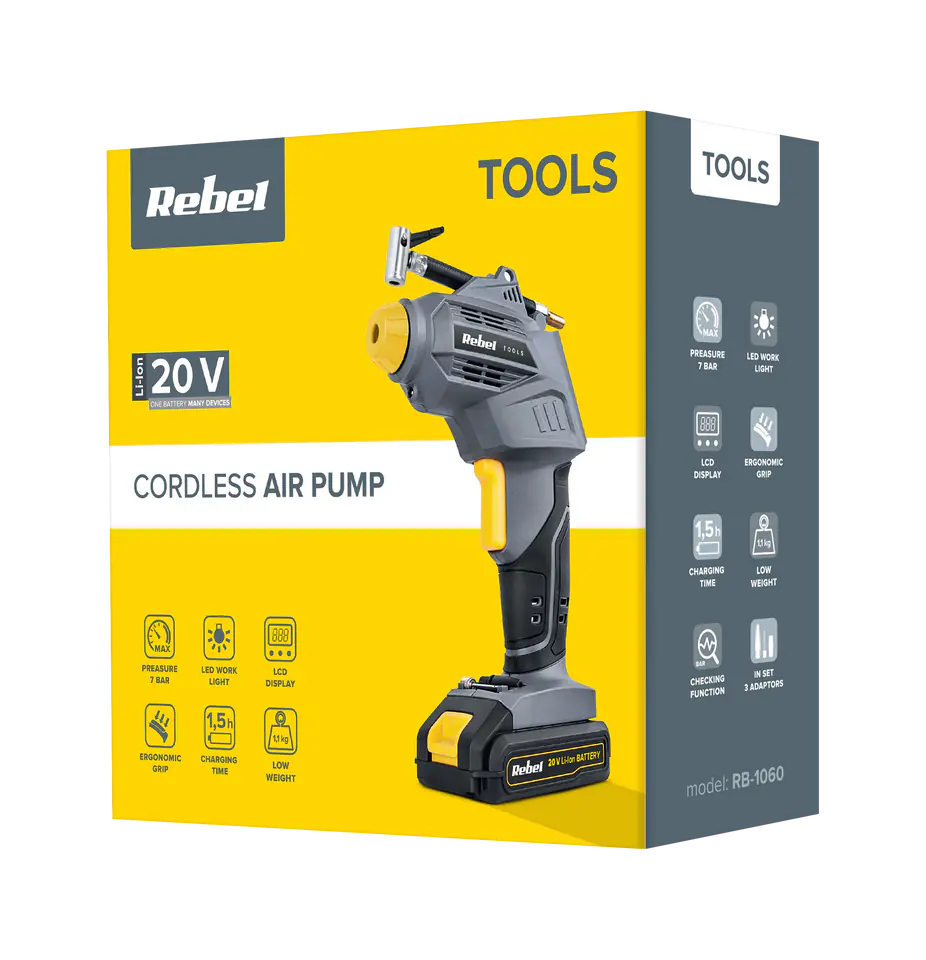 Forget about the hand pump and replace it today with a battery compressor from the Rebel Tools series. Thanks to the included accessories, the device will allow you to quickly and effortlessly inflate bicycle and car wheels, as well as toys and other inflatable items, such as mattresses, balls and children's pools.