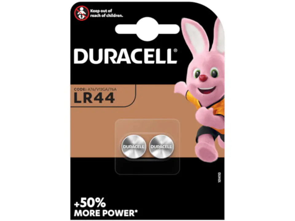DURACELL LR44, A76, or AG13 button cells are the most common of button cell batteries. They are manufactured in large quantities, and are available from every battery company with a range of button batteries.All LR44 cells have a standard voltage of 1.5V, and size of 11.6mm in diameter by 5.4mm in height. As an alkaline button cell, they are inexpensive to produce. This allows for really cheap prices to end users. The multitude of battery suppliers has resulted in many different names for the A76 battery, including LR44, AG13, G13, L1154, V13GA, plus many more.LR44 button cells are used in hand-held electronic toys, calculators, LED lights in wheel nuts on cars, and just about every other place that a small amount of electricity is required at a low cost. In low-drain applications such as watches or calculators, an SG13 button cell (also called SR44, 357 or EPX76) can be used to replace the LR44. This uses Silver Oxide technology, and will last much longer. High power devices, such as laser pointers or toys are better off with an A76/LR44.