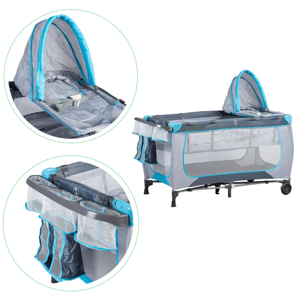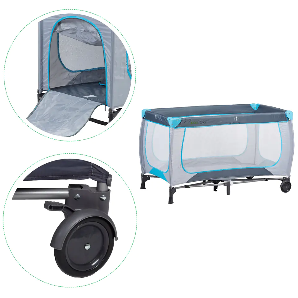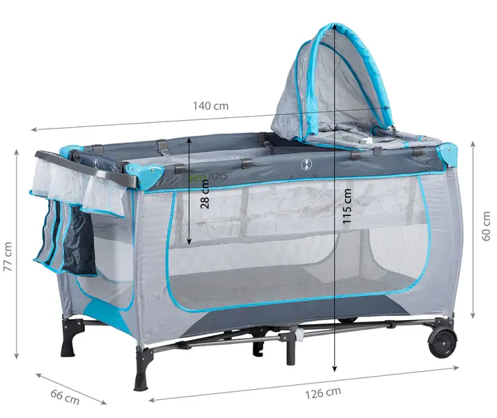 Wheels with brakes prevent accidental movement of the cot, and solid legs guarantee stability.