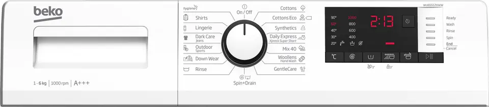 | Washing programs: | Hygiene air refresh, Cotton, Spin, Quick 14min, Eco, Rinse, Synthetics, Pre-wash, Hand/wool, Jeans/denim, Mix |