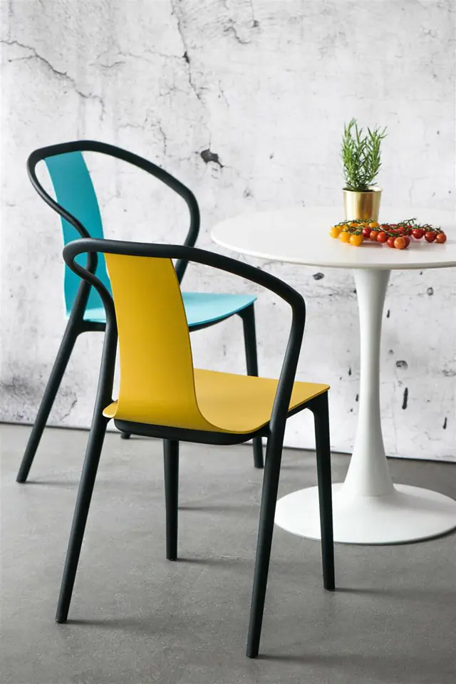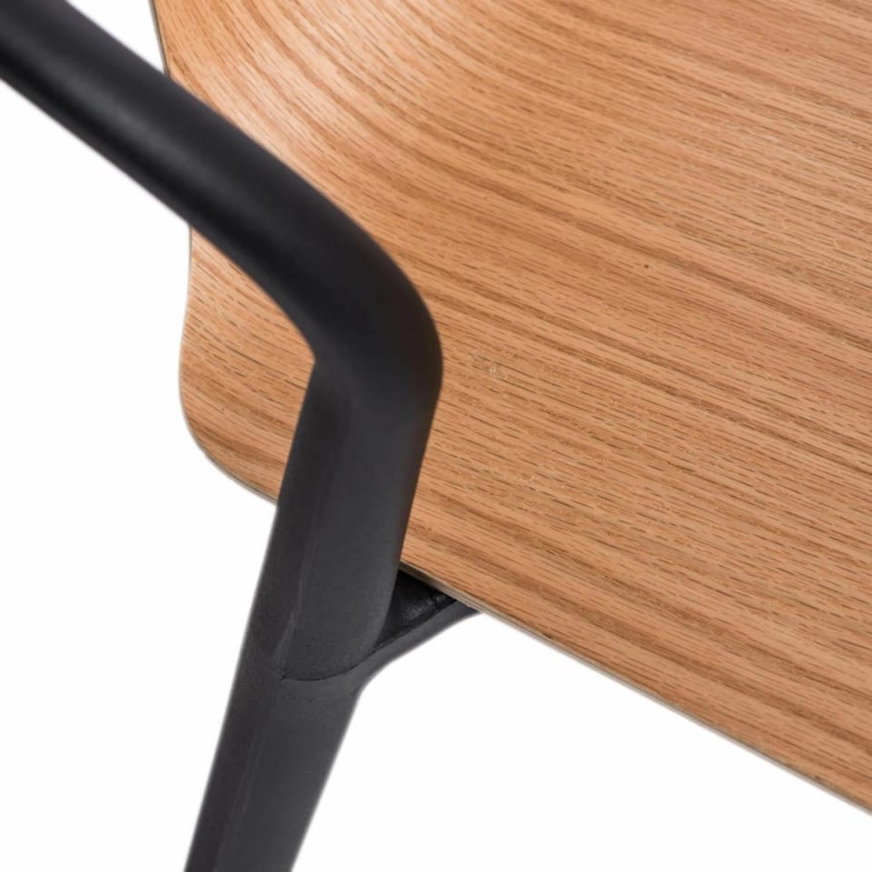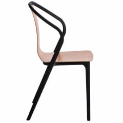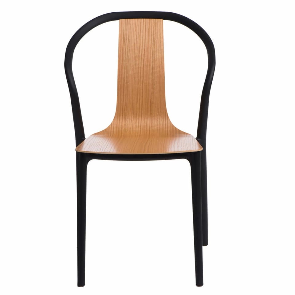 The modern Bella chair is made of extremely durable plastic and wood. The seat in natural color blends perfectly with the black base. The polypropylene used in the chair has a matte finish, is easy to clean and resistant to dirt, while the seat made of plywood is finished in a semi-matt. The chair is designed in a modern style. The chair is lightweight, weighs only 5kg, its maximum load is 100kg. The chair can be stacked, does not require assembly. Armrest height: 73,5cm Seat height: 47,5cm Seat depth: 42,5 Seat width: 42,5cm Max. number of pieces in a carton: 4 Carton dimensions 72cmx55cmx103cm