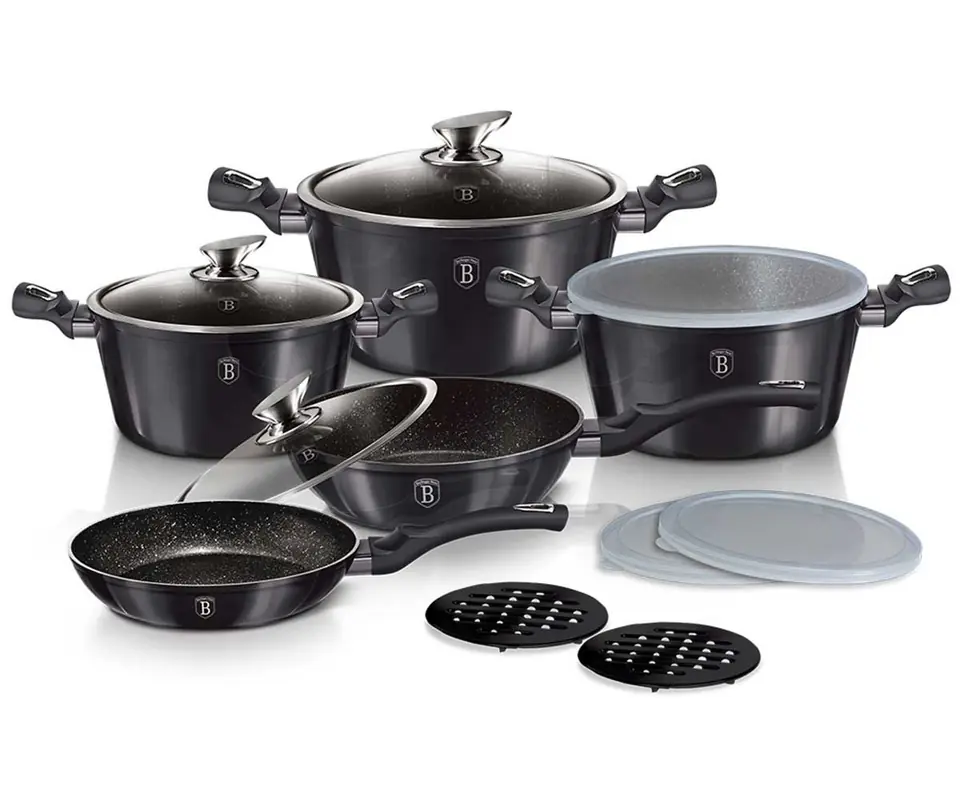The carbon PRO series dishes from BERLINGER HAUS are made of high-quality cast aluminium coated inside with a triple granite coating (marble) with a very high hardness coefficient. Outer coating in graphite metallic color. These attractive and fashionable dishes are equipped with SOFT TOUCH handles (silicone handle) as standard. Suitable for all types of cookers: gas, electric, ceramic, halogen, induction. The TURBO INDUCTION system (they heat up very quickly) can save up to 35% of energy.