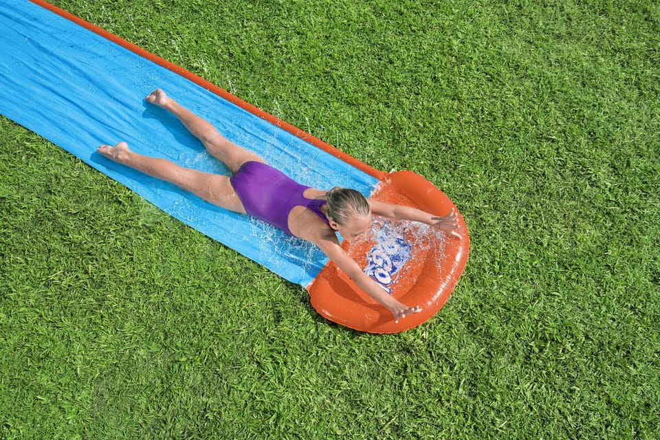 The H2OGO! ® Tsunami Splash Ramp™ single slide is made for summer fun in the garden! This 16-foot slide has a Tsunami Splash Ramp™ that pushes water waves out from under the ramp for an incredibly smooth, fast and wet ride! Tsunami Splash Ramp™ creates a soft landing and increases speed with each slip. Combined with SplashBoost™ Sprinkler technology, a system built to provide targeted water coverage to optimize sliding, spraying and splashing. The Tsunami Splash Ramp single slide is designed to keep you cool and create a wave of fun. With quick and easy setup and simple removal, this amazing slide will make parents and children jump for joy.