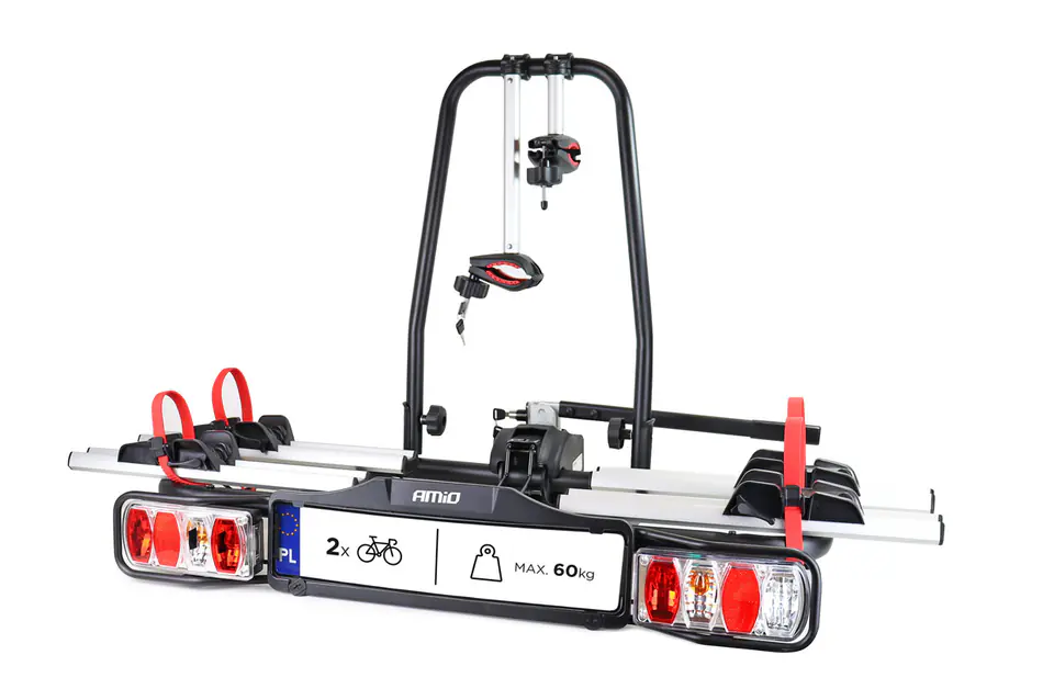 RACK ADDITIONALLY REINFORCED FOR ELECTRIC BIKES - UP TO 60 KG Solid tilting platform mounted on a hook for transporting from one to four bicycles. Easy to install, practical bike rack with high payload. The mount allows safe, quick assembly and does not require tools. The ability to tilt the trunk to open the trunk lid, thanks to the use of a special, easy-to-use button. The tilt function makes it easy to access the trunk of the car also with mounted bicycles. The platform is secured by a special, simple closing system that does not require the use of tools. The rack has a 13 pin plug (you can use a 13/7 adapter) The platform has detachable arms, so you can more easily place the bike on the rack. Very convenient system for mounting bicycles on the rack - just detach the mounts, translate through the bikes, secure with a knob with a key and ready It has all the lights required by law: Position Stop Turn signals (left and right) Backlight backboard (reversing) Fog Material: Steel, aluminum, plastic Number of bicycles: 2 Fits frames with diameter: 20-80 mm Fits bicycles with disc brakes: Yes Fits Electric Bikes: Yes Fits Kids Bikes: Yes Fits "Ladies" Bikes: Yes Theft Protected Bikes: Yes Theft Protected Platform: Yes All Locked with One Key - One Key System! Installation: easy with the pressure lever Possibility of tilting with mounted bicycles: Yes Possibility of transporting bicycles with a wheelbase minimum of 80cm maximum 120 cm Possibility of transporting bicycles with a frame with a minimum diameter of 20 mm maximum 80 mm Possibility of transporting bicycles with tires with a width of maximum width 80 mm Max. load: 60 kg Approval and approval: YES Dimensions (cm): 108 x 57 x 75 Dimensions when folded (cm): 108 x 80 x 30