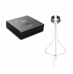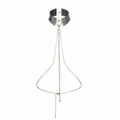 Obroża metaliczna, regulowana, której łańcuszki spływają na klatkę piersiową, tworząc prowokujący i zmysłowy obraz kobiety.