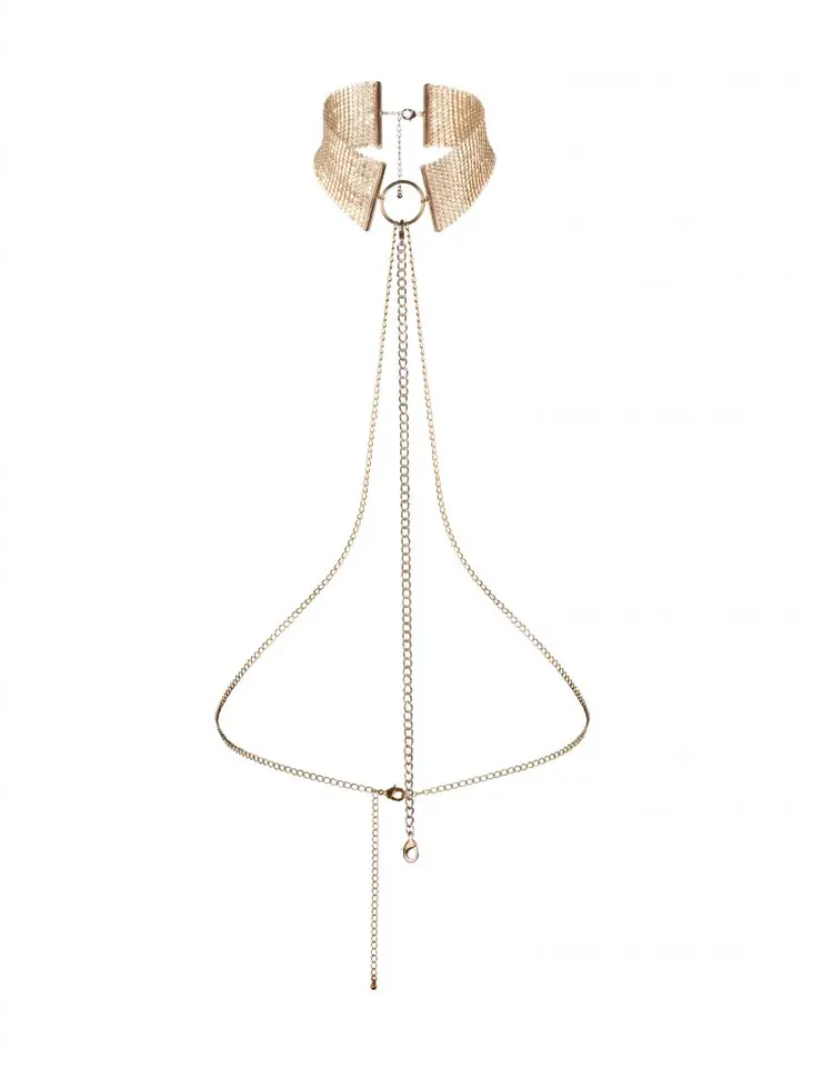 Obroża metaliczna, regulowana, której łańcuszki spływają na klatkę piersiową, tworząc prowokujący i zmysłowy obraz kobiety.