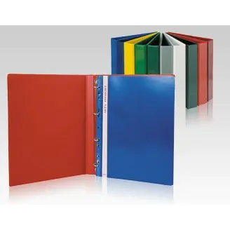 Made of colored PVC film; spine and covers stiffened with cardboard; transparent pockets on the front cover and spine to mark the contents by a title page or label;