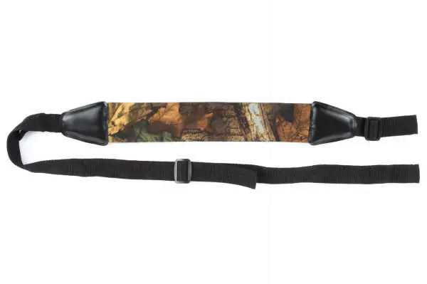 Universal weapon strap, binoculars, air rifle, Moro weapon carry belt. Belt for carrying weapons black with a fragment of cushioning foam, neoprene with camo masking print in autumn, brown tones. Adjustable straps from both ends of the belt allow you to quickly adjust the size of the loop to a specific weapon. The wide part of the belt is made of weight-absorbing foam, thanks to which it protects the arm from discomfort or abrasion. The strap is universal and can also be used for other items such as binoculars, air rifle. It will also be suitable for such items as a guitar, or anything that we want to hang or hang over the shoulder.