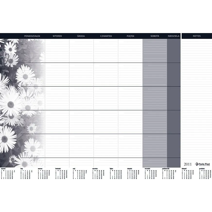 - original design in accordance with the rules of time organization pracy_- two-year or annual calendar (monthly biuwar - month on each page)_- number of sheets 30 _- also available with a protective strip, protecting the cards against zginaniem_- the strip has a special bottom layer that allows suction to the ground, without the possibility of moving the adu_ socket - dimensions: 470 x 330 mm or A2