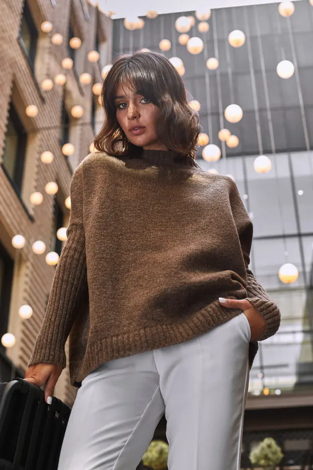 An elegant, thick sweater with kimono sleeves, finished with a long narrow welt is both a proposal for elegant trousers and skirts as well as for everyday jeans. The sleeves can be worn lowered or pulled up, and the loose bottom of the sweater can be pulled a piece under the belt to create a fashionable look.