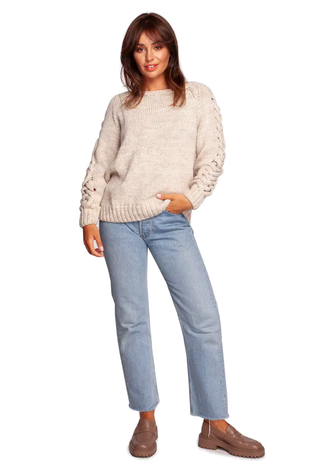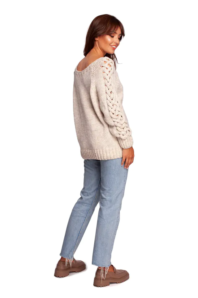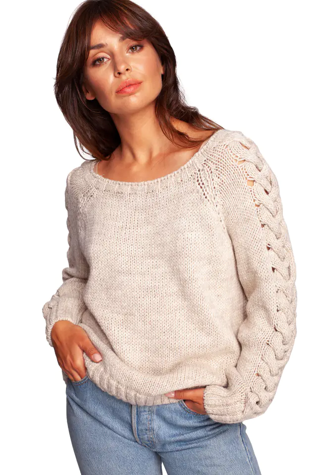 BK090 Sweater with wide neckline and braid on the sleeves - beige Beige, size L/XL