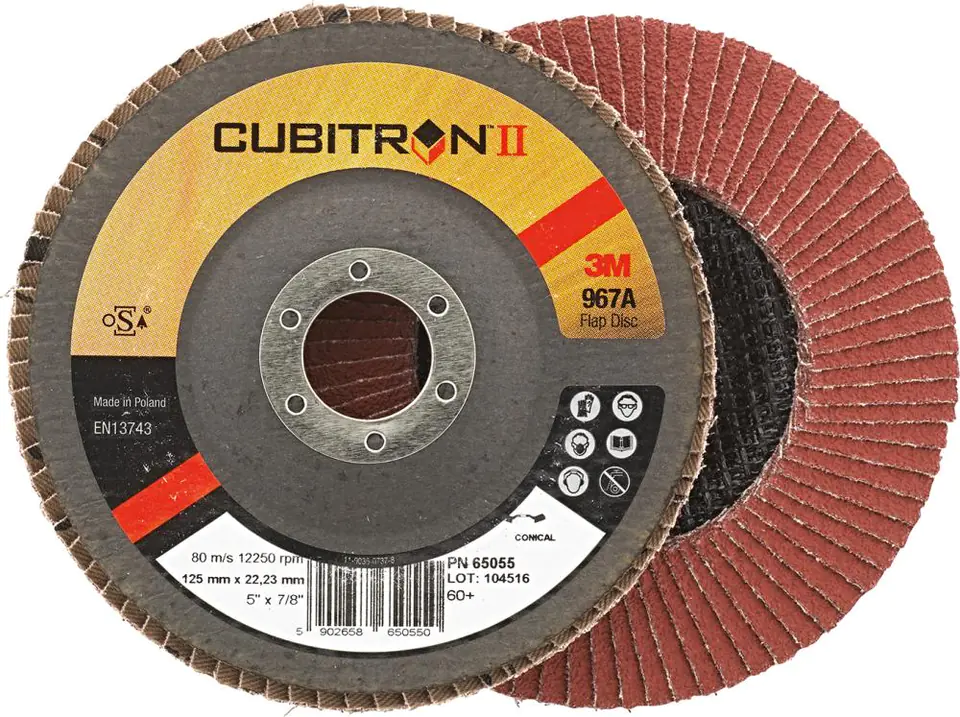 Material: precisely shaped ceramic grain (CubitronTM II), bonded with synthetic resin permanent connection with a plate reinforced with fiberglass. The individual ceramic grains are precisely formed, of the same size, perpendicularly set and have the shape of small triangles. Very aggressive grinding with maximum abrasion efficiency with 30% faster abrasion. Active additives during grinding prevent clogging and provide a cooler grind. Standard hole 22.23 mm.