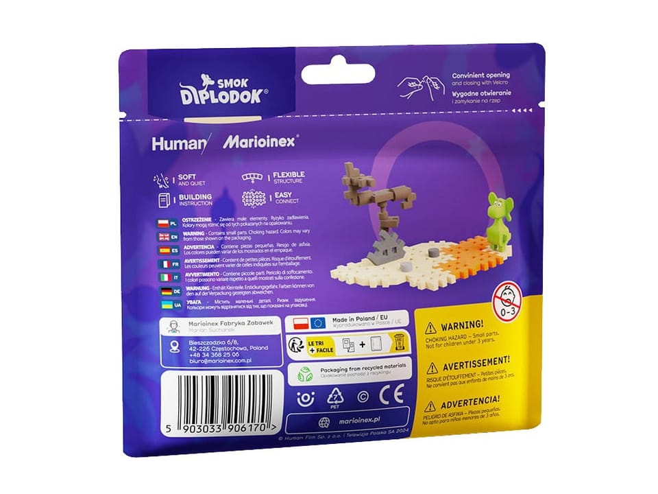 The Diplodocus and Desert set from the Mini Waffle series includes 25 pieces, from which you will create a piece of desert with distinctive vegetation, and a figurine of the hilarious Diplodocus dragon. This curious dragon is constantly travelling and discovering new bits of the world. Go on an adventure together!