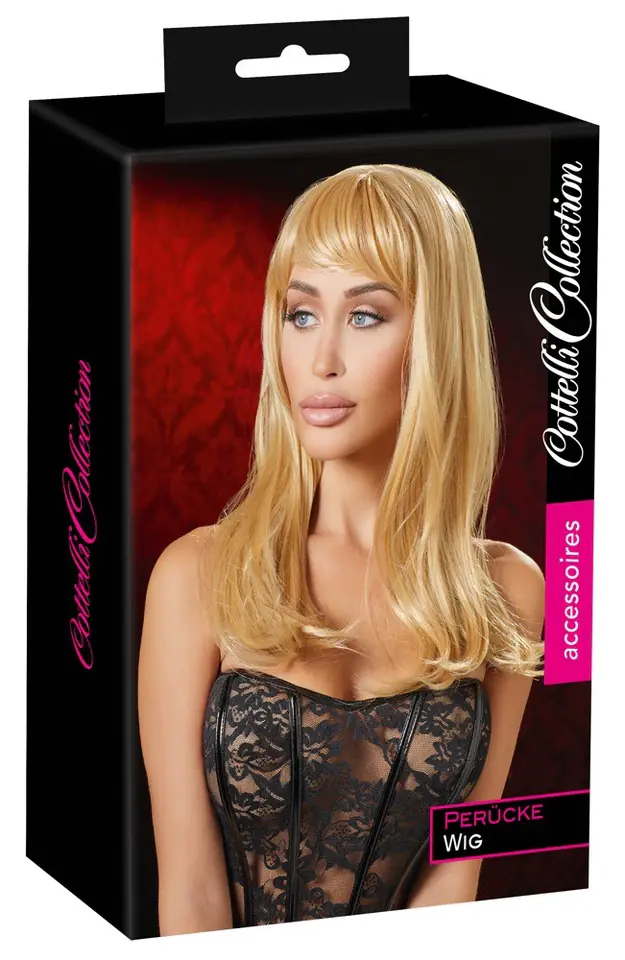 Realistic looking blonde wig with straight hair.