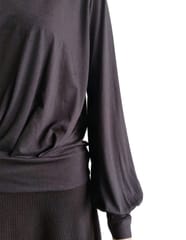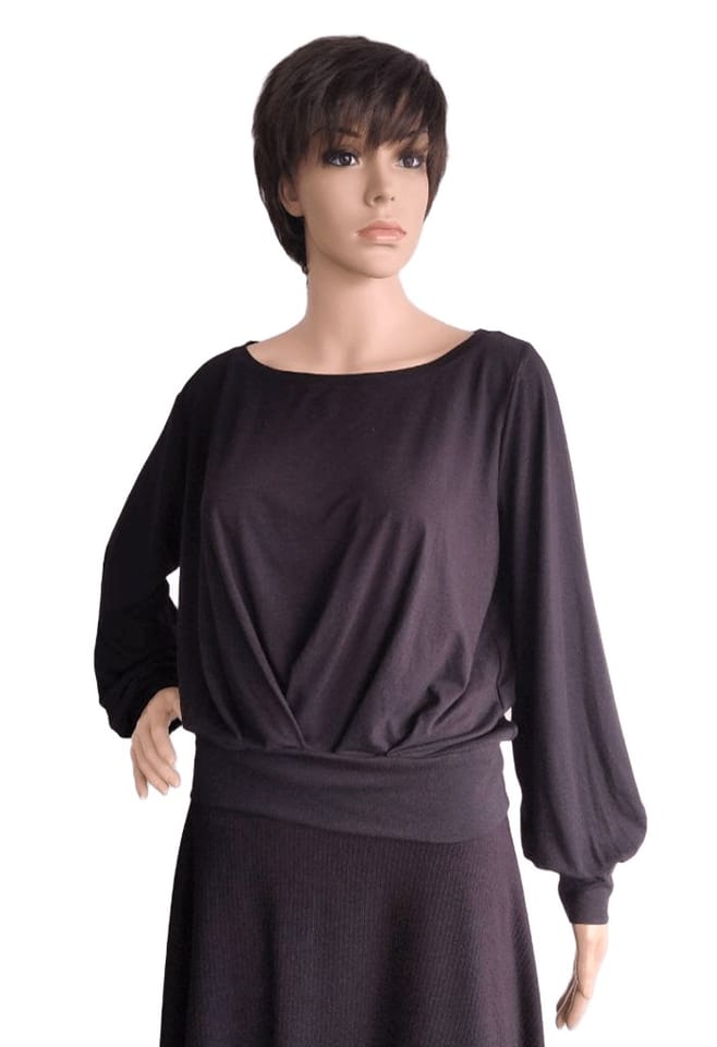Smooth women's blouse on the front decorated with stitched pleats. Half-round neckline. Long, loose sleeve finished with welt.