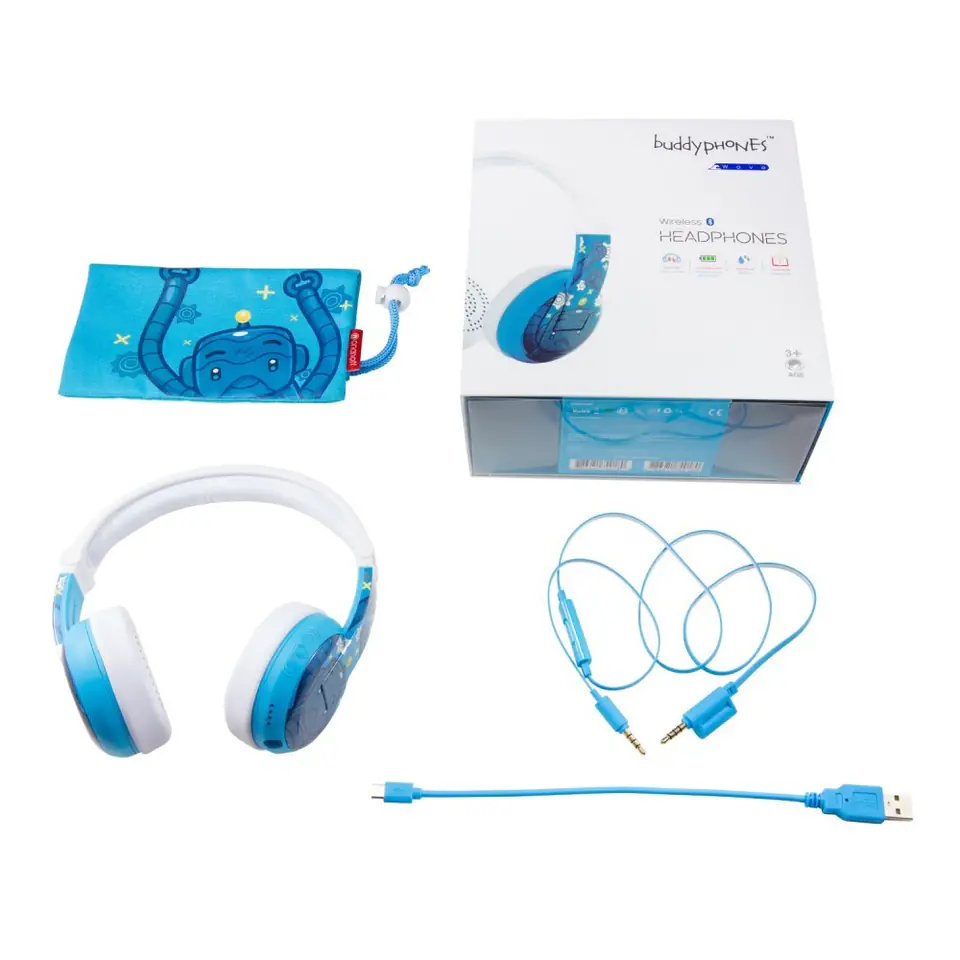 BuddyPhones Wave Robot, BT-BP-WV-ROBOT Wireless Bluetooth Headphones for Kids 3+, Volume Limited (75/85/94dB), with Microphone, with BuddyJack Splitter, Waterproof