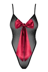Seksowne i frywolne body, wygodne, regulowane ramiączka, kilkustopniowe zapięcie na plecach. Czerwona kokarda, odsłonięte pośladki i plecy. Bardzo miękki i elastyczny materiał (90% poliamid, 10% elastan).
