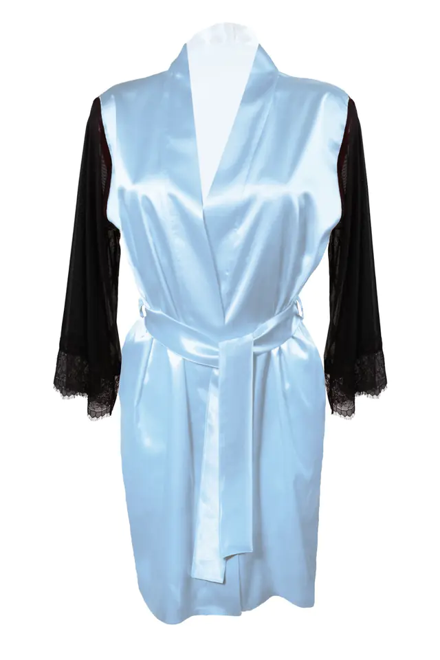 ELEGANCKI I NIEZWYKLE SEKSOWNY SZLAFROCZEK Z DELIKATNEJ SATYNY. TIULOWE RĘKAWY WYKOŃCZONE KORONKĄ, DODAJĄ MNÓSTWO PIKANTERII. PRAKTYCZNE WIĄZANIE W PASIE IDEALNIE DOPASOWUJE SIĘ DO SYLWETKI, UWYDATNIAJĄC ATUTY KOBIECEGO CIAŁA