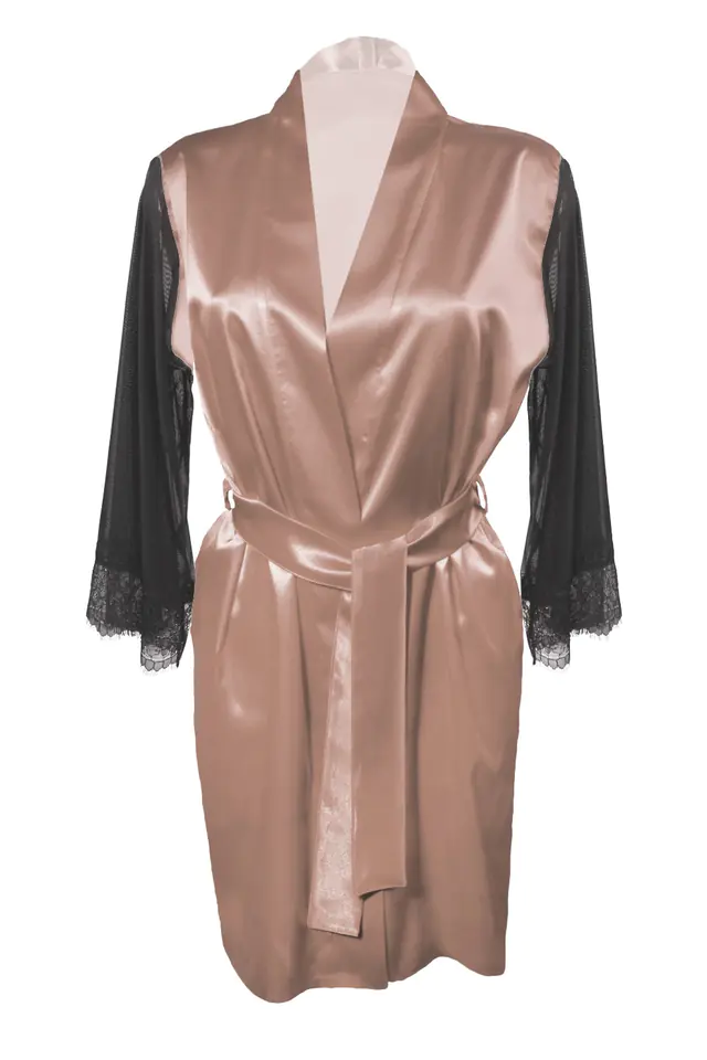 ELEGANCKI I NIEZWYKLE SEKSOWNY SZLAFROCZEK Z DELIKATNEJ SATYNY. TIULOWE RĘKAWY WYKOŃCZONE KORONKĄ, DODAJĄ MNÓSTWO PIKANTERII. PRAKTYCZNE WIĄZANIE W PASIE IDEALNIE DOPASOWUJE SIĘ DO SYLWETKI, UWYDATNIAJĄC ATUTY KOBIECEGO CIAŁA