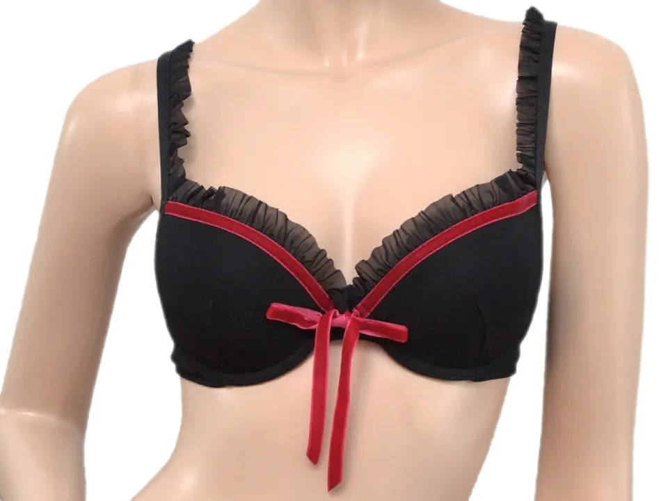 Bra with underwire and stiffened cups. The combination of tulle frills and plush piping gives it a sensual look. Comfortable, stiffened cups nicely collect and support the breasts.