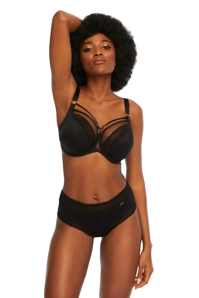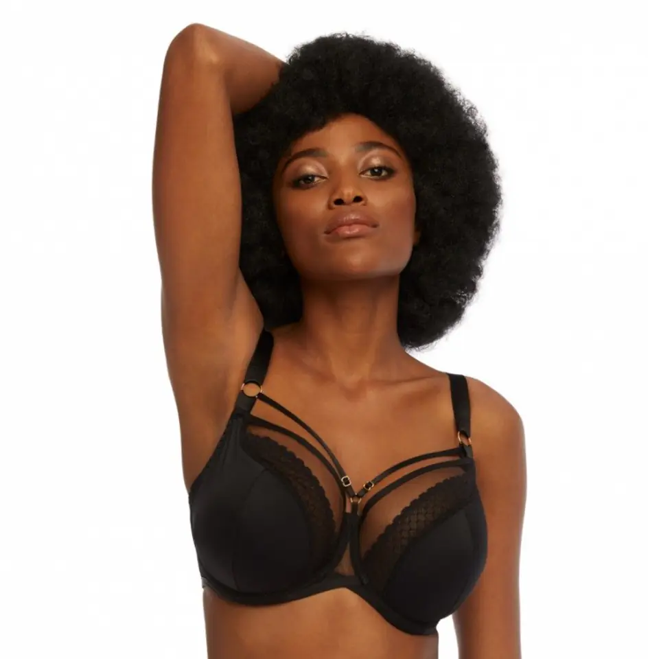 Semi-stiffened bra made of foam, lace and mesh. For the production of the model, thin foam was used, thanks to which the bust is nicely shaped and at the same time imperceptible. The design of the bra perfectly collects the bust. The upper part of the cup is finished in an elegant way with lace and mesh. In addition, there are decorative straps with gold circles and regulators. Sides made of mesh finished with an elastic band. It has adjustable, non-detachable straps. Fastened with a double hook.
