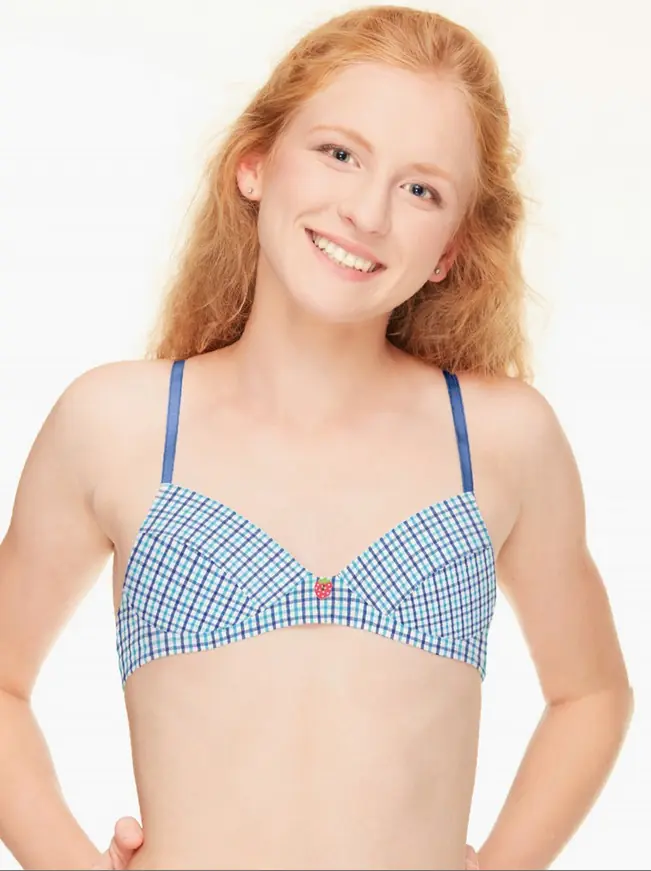 Biustonosz dla nastolatek w kratkę z usztywnionymi miseczkami, wzmocnione dzięki miękkiej gąbce i specjalnym przeszyciom, bez metalowych fiszbin. Skład: 95% bawełna, 5% elastan.