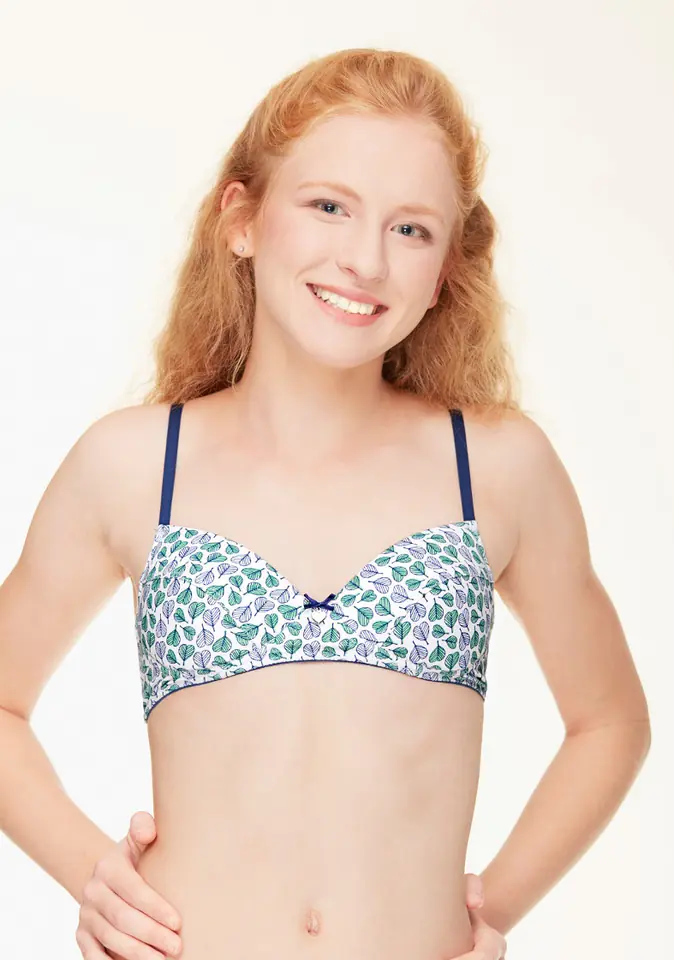 Wygodny biustonosz dla nastolatek uszyty z miękkiej i przyjemnej dla ciała wzorzystej bawełny. Miseczki delikatnie usztywnione gąbeczką, bez fiszbin - na ich łączeniu satynowa kokardka ze srebrnym serduszkiem. Ramiączka regulowane.
