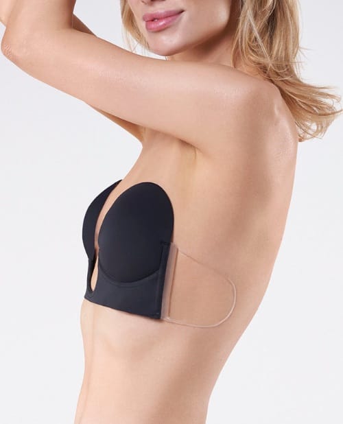 Samonośny biustonosz, mocno wycięty po środku, idealny do głębokich dekoltów. Doskonale sprawdzi się także z odzieżą, która odsłania nagie ramiona czy plecy - biustonosz nie posiada żadnych widocznych zapięć czy ramiączek. Miseczki na tzw. bezpiecznym kleju medycznym, z fiszbinami u podstawy, łatwo przylegają do ciała, pozwalają unieść biust, a wieczorem można szybko i bezpiecznie zdjąć go, przepłukać pod bieżącą wodą i przygotować do ponownego użycia. Boki na bezbarwnych skrzydełkach, dodatkowo podnoszą komfort użytkowania biustonosza. Biustonosz z kategorii Must Have - na imprezę, sylwestra, randkę, do wszelkich, nietypowych bluzek i sukienek.
