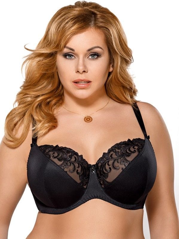 Beautiful, classic soft bra from the BIG series. Made of smooth raw materials combined with elegant embroidery. The cups collect the bust well and keep it in place, nicely exposing the neckline. The lower parts of the cups are made of stable, smooth, matte knitwear. The upper part is made of embroidery for reinforcement lined with delicate mesh. Baskinka made of the same smooth knitwear as the cups, reinforced with stable tulle. The cups are profiled with a wire surrounding the breasts, which makes the breasts perfectly gathered inside, raised and maintain a beautiful, rounded shape. In the middle, between the cups, a bow decorated with tiny jewelry. Sides made of elastic, tensile resistant knitwear type lycra. Vertical underwire in all bra sizes. Straps smooth, adjustable, not detachable, different widths depending on the size. On the joints with bowls a small bow. Fastening: hook d