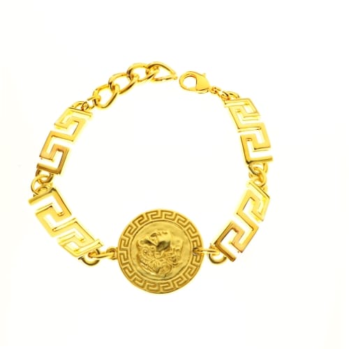The latest Colibra Igual collection combines the beauty and delicacy of pearls with strong elements such as thick chains of various weaves or large pendants. Bracelet length 23cm. Width 1cm. Coin diameter 2,5cm.