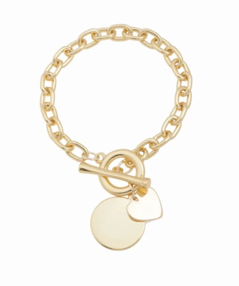 Bracelet from the spring collection with a length of 21cm. Heart 1.5cm x 1.5cm plaque with a diameter of 2.2cm - the possibility of engraving. Toggle clasp (circle and stick). Gold plated bracelet.