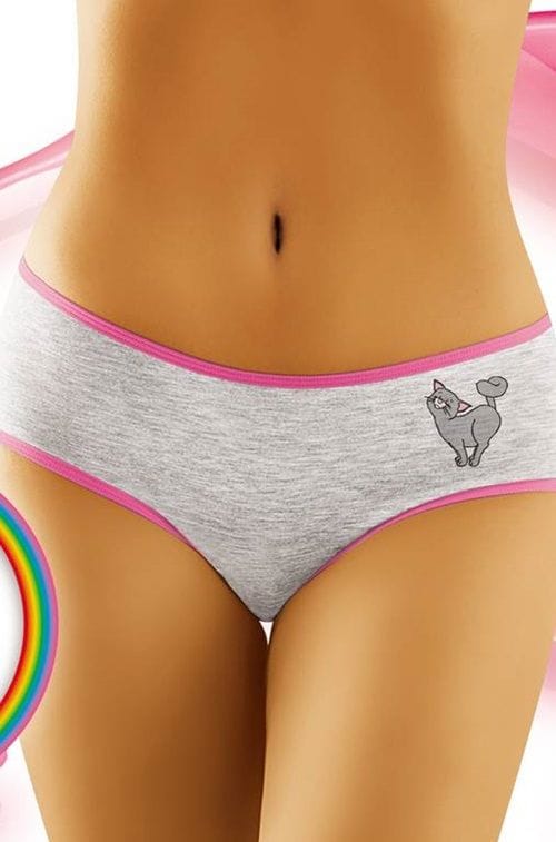Sweet, cotton briefs with a print of a stretching cat. On the back, on the buttocks reflected cat's paws... The whole in a delicate, gray color, with pink trimming.