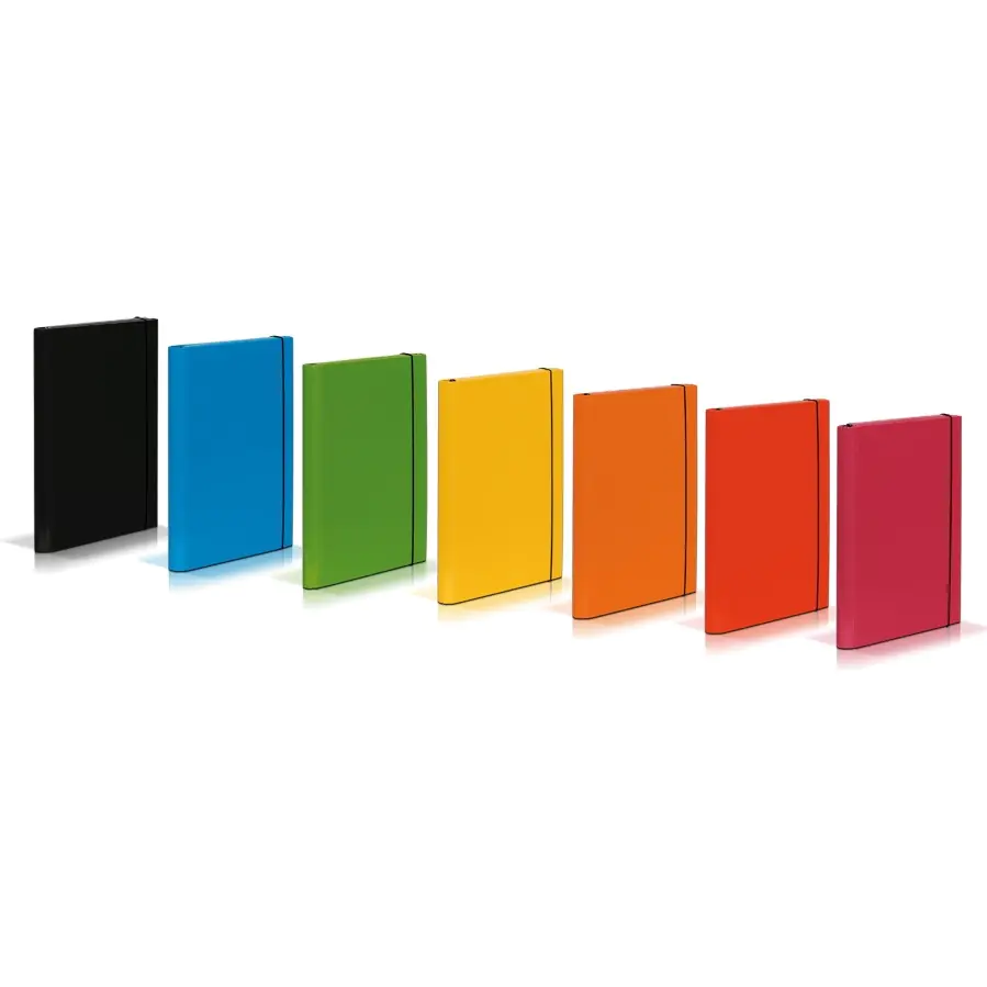 Briefcase with a spine width of 4cm, made of hard 2mm cardboard coated with PP foil. It has a black endpaper made of high quality raw material. Lockable gumkę._