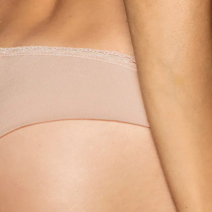Figi damskie brazyliany wykonane z wysokiej jakości modalu. Pas wykończony ażurową koronkową tasiemką. Pakowane po 2 sztuki. Skład: 95% modal, 5% elastan.