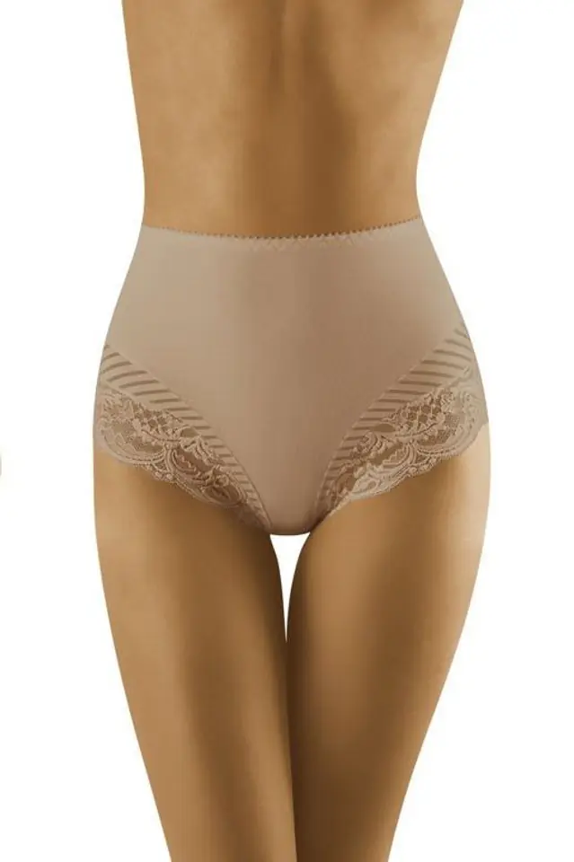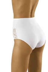Bawełniane figi o wyższym kroju, zdobione przy udach koronką i ciekawym, transparentnym tiulem w paski. Te dwa desenie zestawione z wygodną, gładką tkaniną wspólnie tworzą niebanalną aranżację, dzięki którym biodra prezentują się elegancko i zgrabnie. Krój delikatnie modeluje brzuszek. Skład: 72% bawełna, 28% elastan.