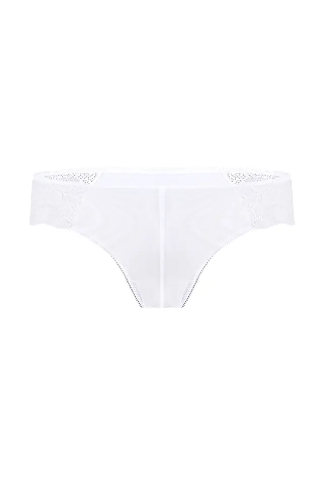 Eleganckie figi damskie. Boczki wykonane z koronki. Tył z podwójnej delikatnej siateczki , bezszwowo wykończonej. Materiał: 62% poliamid, 25% poliester, 10% elastan, 3% bawełna.