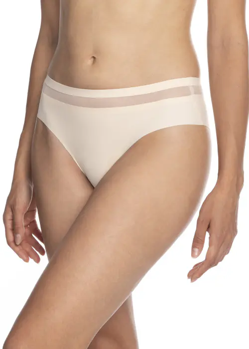 Figi damskie wykonane w technologii laserowej, bezszwowej z mikrofibry z cienkim wykończeniem brzegów. Linię talii zdobi wstawka transparentnej siateczki. Skład: 75% poliamid, 25% elastan