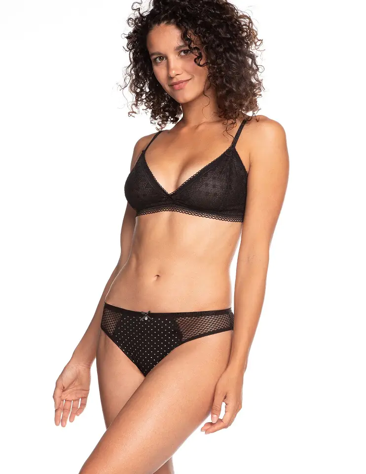 Bawełniane figi damskie o kroju mini bikini, obniżona linia talii, tył z ażurowej koronki. Pakowane w pudełko po dwie sztuki. Skład: 95% wiskoza, 5% elastan.