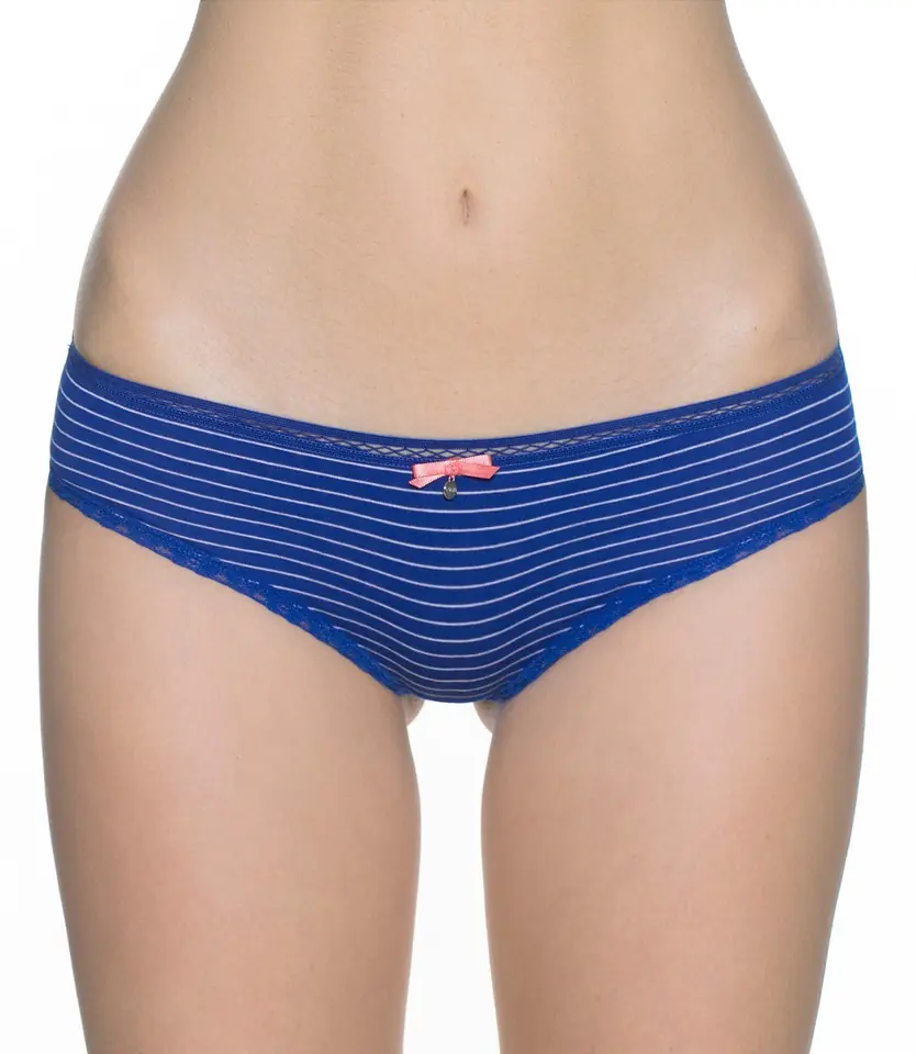 Women's briefs in stylish stripes, made of high quality cotton. Back with decorative lace finish, flat decorative rubber at the waist with bow and pendant. Packed in a box of two (blue and green).
