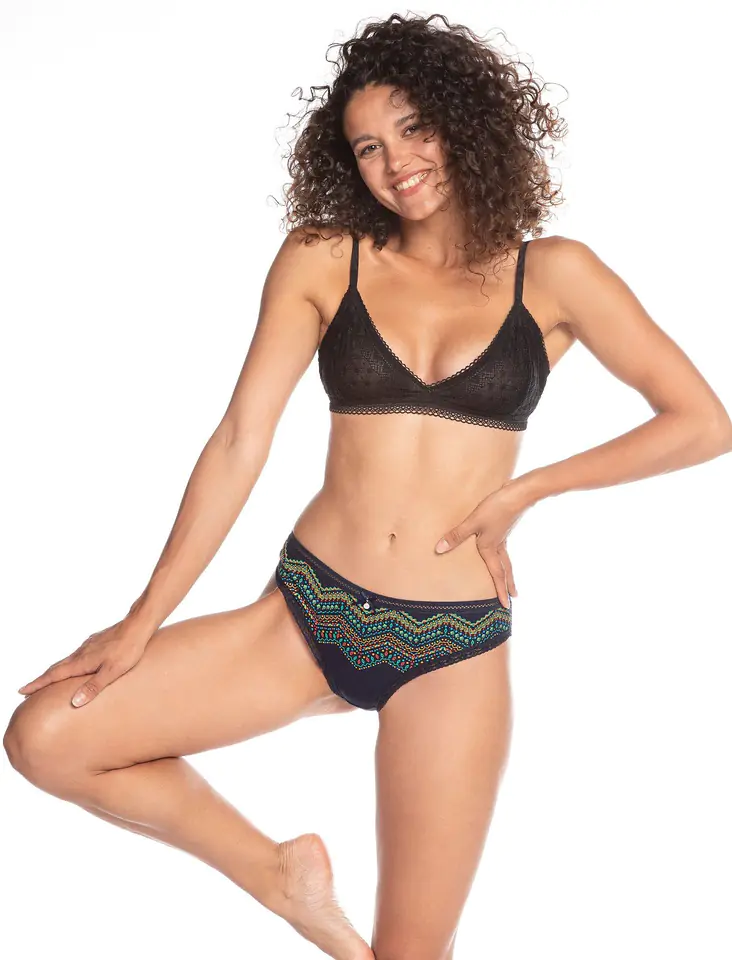 Women's briefs with mini bikini cut. Lowered waist line, narrow side, back finished with openwork lace. Flat elastic band at the waist. Packed in a box of two. fabric content: 95% cotton, 5% elastane