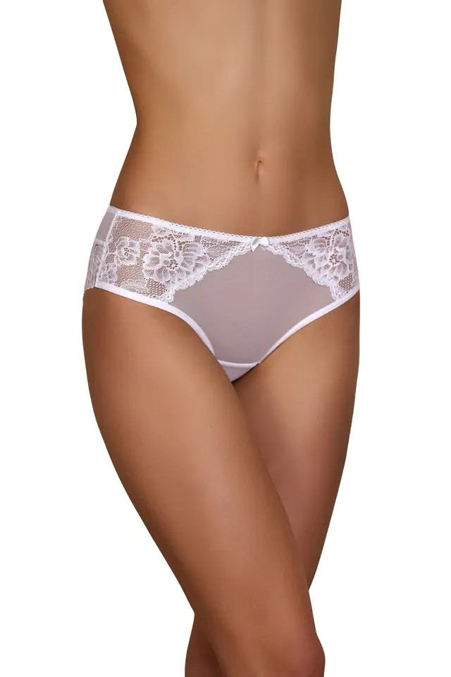 Figi damskie wykonane z delikatnej siateczki i koronki o kwiatowym motywie. Posiadają szersze boki. Skład: 85% poliamid, 15% elastan.