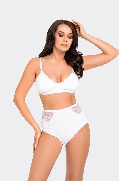 Cotton briefs, higher in cut. Model with profiling cuts, with a lace insert on both sides. Comfortable, elastic band at the waist. Composition: 92% cotton, 8% elastane.