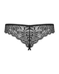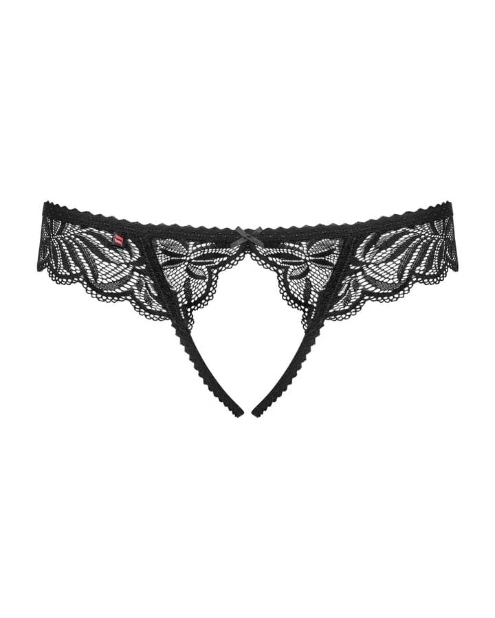 Sexy black, hot thong with an open step. Lace style, decoration on the front in the form of a small bow. Soft and delicate Multistretch material (90% polyamide, 10% elastane).