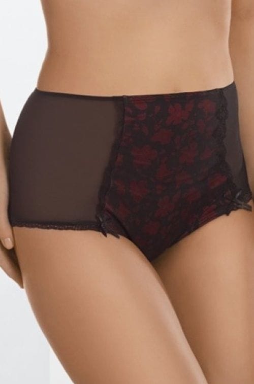 If you are looking for something else - this proposal is for you. Slightly higher briefs with tulle sides. Front flowery, black and red.