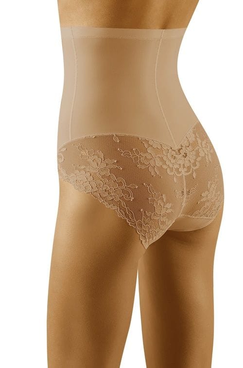 High briefs decorated with lace on the buttocks. A line modeling the region of the abdomen and hips. Smooth front and back, made of spcialist knitwear, subtly slims the body and improves body shapes. A higher condition is also an optical slimming of the waist area, the top from the inside lined with silicone, increases the comfort of wearing underwear and protects it from slipping off the body. Composition: 58% polyamide, 42% elastane.